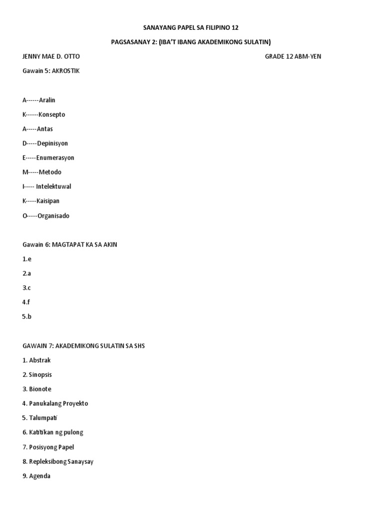 Filipino 12 Week 2 Jenny Mae D Otto Grade 12 Abm Yen Pdf