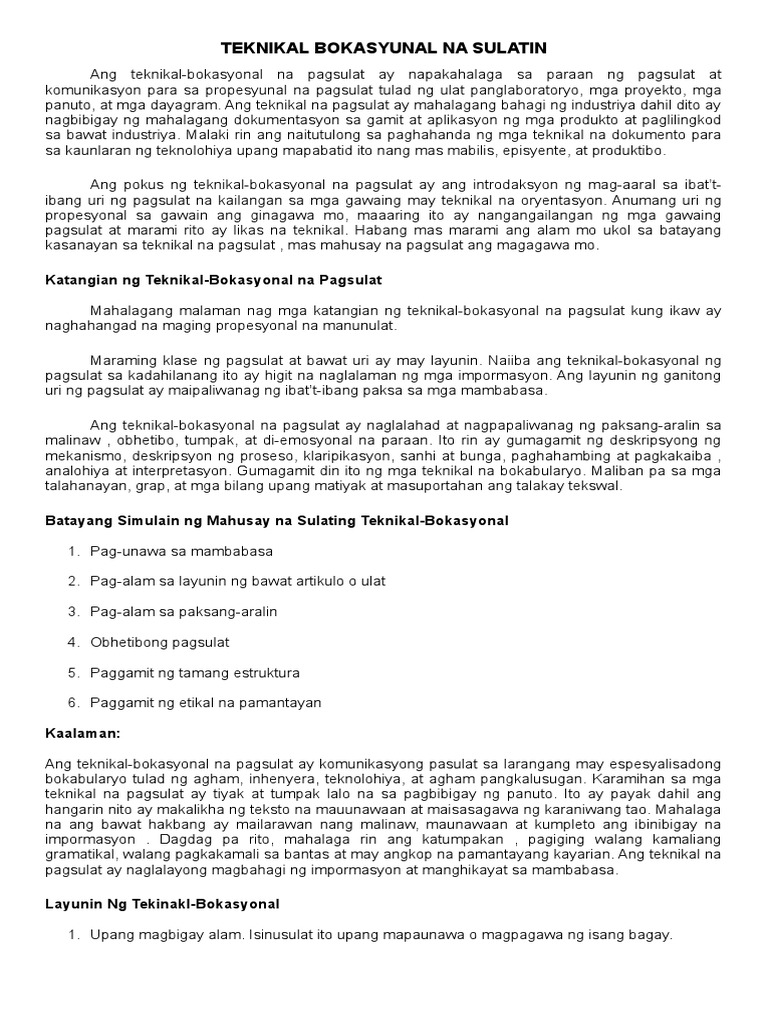 Ano ang ibat ibang anyo ng sulating teknikal bokasyonal. Gumagamit ng teknikal na terminolohiya sa isang paksa katulad ng siyensya o agham science at teknolohiya technology. Ang teknikal-bokasyunal na sulatin sa Filipino sa Piling Larang.