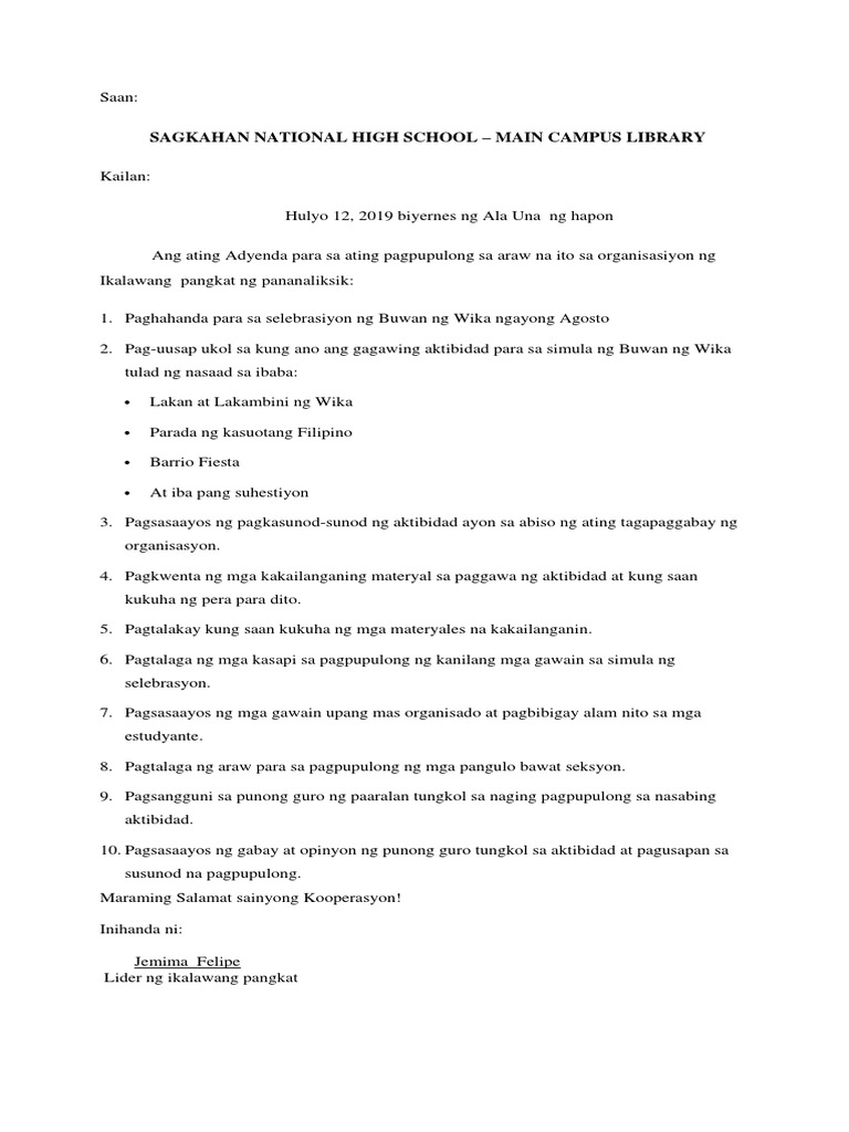 Ito ang naglalaman ng mga impormasyong importante mga aksyon na dapat gawin tungkol sa mga problemang hinaharap at ang paksa ng talakayan. Tinutukoy ang oras ng. Kasanayan sa pagsulat ng Agenda 10.