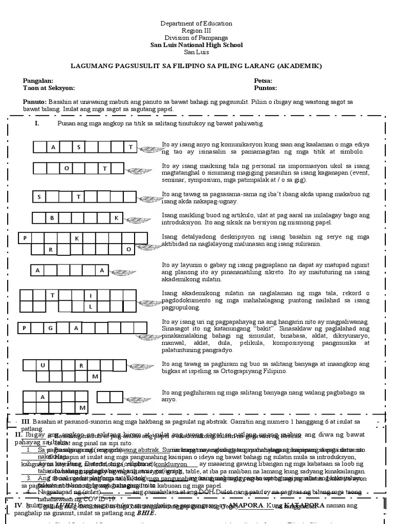 Lagumang Pagsusulit Sa Filipino Sa Piling Larang Pdf